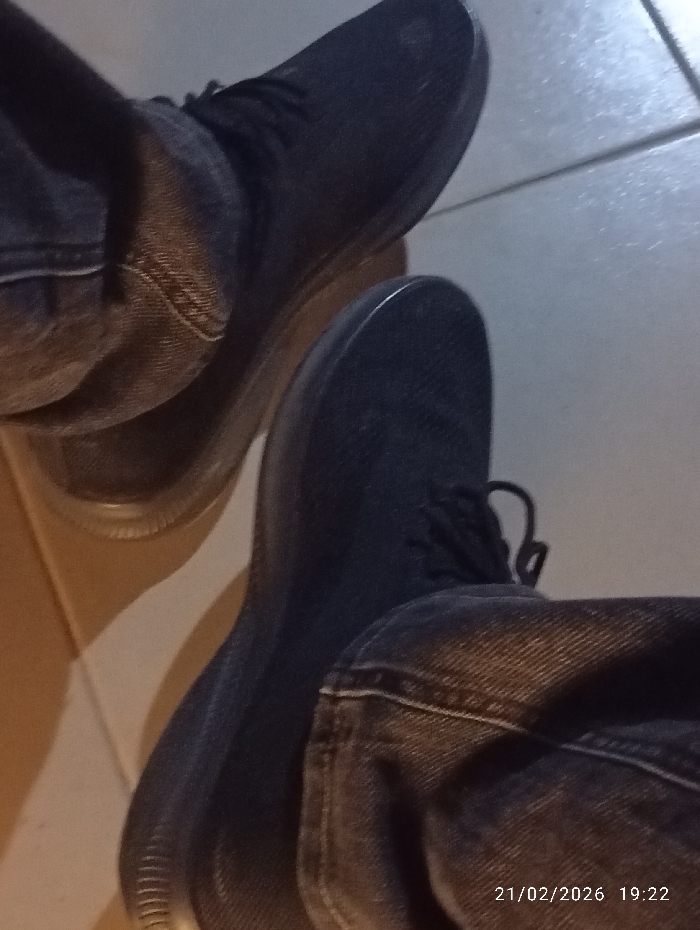 Two feet wearing black sneakers and dark denim jeans are positioned on a tiled surface. The right foot is in the foreground while the left is slightly behind. The lighting is dim, casting shadows on the floor. The jeans have noticeable stitching and a textured appearance. A time stamp is visible in the bottom right corner.