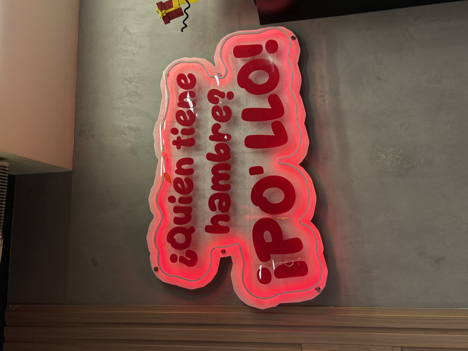 A neon sign in Spanish reads "¿quién tiene hambre? ¡P