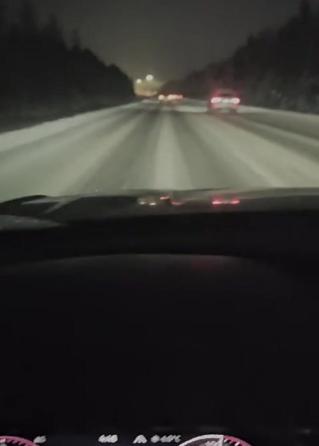 view from inside a car driving on a snow-covered highway at night. Other cars are visible in the distance. Trees line the side of the road. The windshield is somewhat obscured by dirt.