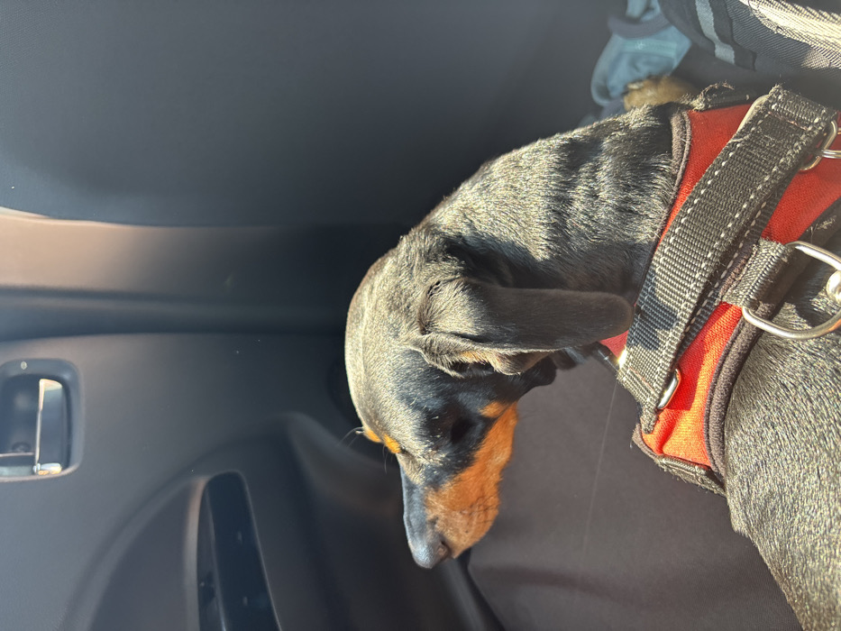 A dachshund with a black and brown coat rests in a car. The dog is wearing a red harness with black straps. The dog is looking down. The car's interior is visible, including the door panel, handle, and a glimpse of a gray, patterned fabric near the top of the frame. Sunlight illuminates parts of the dog and the car's interior.
