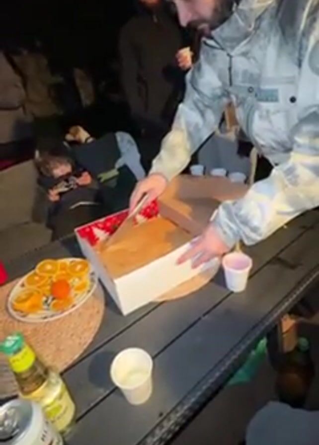 A group of people are gathered outside at night. A man in a camouflage jacket and beanie is cutting a large square cake from a white cardboard box on a black picnic table. A plate of sliced oranges and tangerines sits on the table, along with various beverages and paper cups. Behind the man, another man with a headlamp observes, holding a cup. A child is lying on a couch in the background, looking at a phone. Music is playing. The setting appears to be a backyard or outdoor social gathering.