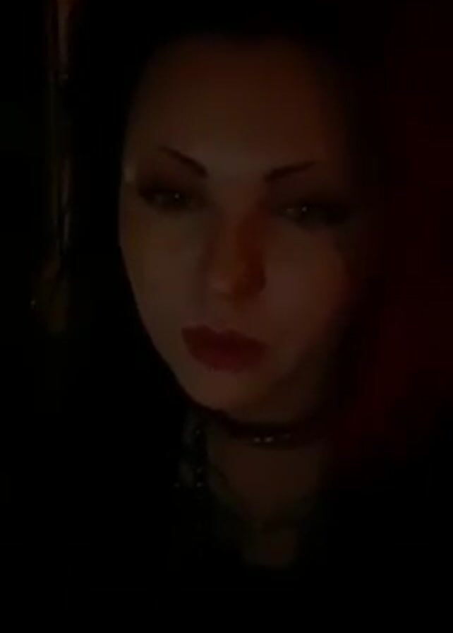 A close-up video depicts a person yawning. The person has dark hair, fair skin, defined eyebrows, red lipstick, and a choker necklace. They raise a hand with a tattoo on the fingers to cover their mouth while yawning. The background is dark with a suggestion of a window to the left and red light to the right.
