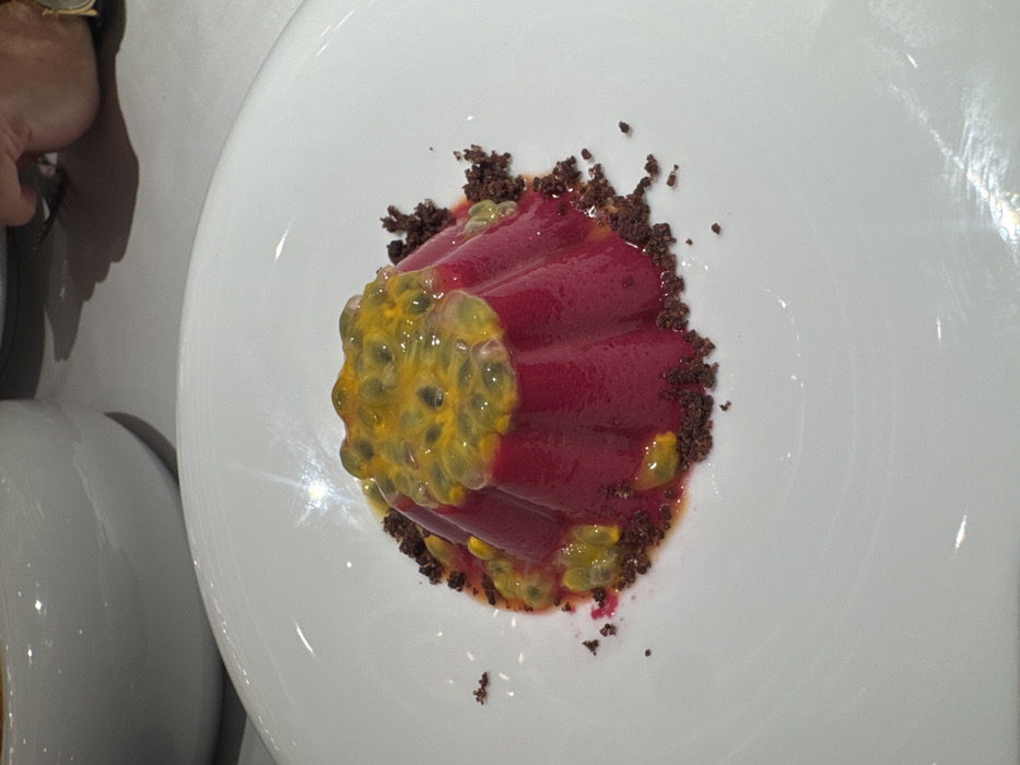 A dessert is presented on a white plate. It consists of a red, fluted jelly-like base topped with passion fruit pulp. Dark crumbs, possibly chocolate, encircle the base of the dessert, providing a textural contrast. The plate is glossy with evident light reflections. A hand with a watch is visible in the periphery of the image.