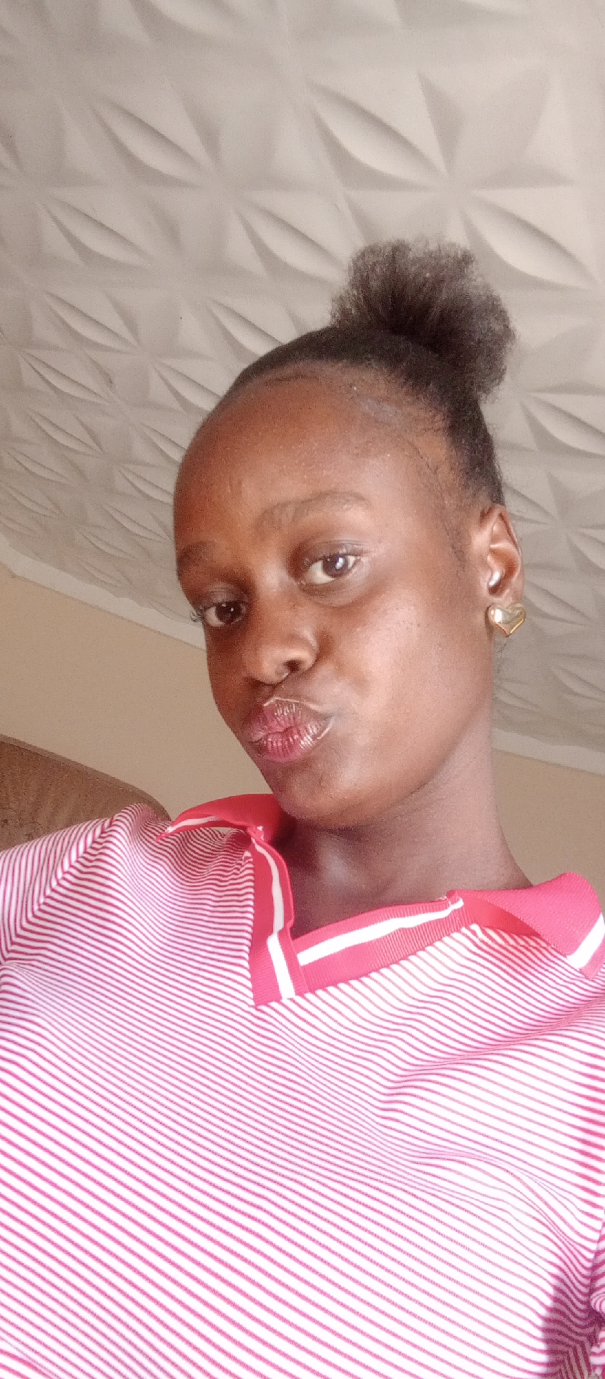 The photograph shows a young, dark-skinned woman in a close-up shot. She has her hair pulled up in a bun. She is wearing a pink and white striped polo shirt. She is puckering her lips, looking at the camera. The background includes a white ceiling with a textured pattern and a beige wall. The location is indoors, in the city of Unknown, Unknown.
