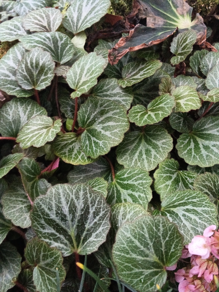 A dense cluster of round, variegated leaves dominates the view. The leaves exhibit a pattern of light green veins contrasted against a darker green background. Red stems support each leaf. A few pink flowers appear in the lower right corner. A large, dark green leaf with brown edges is visible in the upper right corner. Moss is also present, adding to the natural setting.
