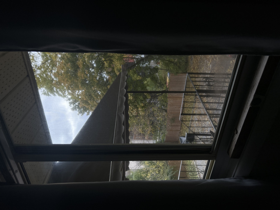 The image displays an exterior view through a window from an interior perspective in Kingston, Canada. Dark fabric curtains partially obscure the left and right sides of the scene, with a white window frame and a wooden sill strip visible at the bottom. The environment outside is overcast, suggesting rain or recent precipitation, with visible water droplets on the window pane. A beige fabric awning with a scalloped edge extends over a porch or entrance, dominating the upper left and central portions of the exterior view. Below the awning, a black metal railing with decorative scrollwork outlines steps leading down to a ground area. This ground is saturated with fallen autumn leaves, primarily in shades of yellow and brown, indicating the season. A dark, possibly plastic, outdoor container is situated near the railing's base. In the mid-ground, a light-colored wooden privacy fence horizontally traverses the scene. Beyond the fence, a dense cluster of deciduous trees with green and yellowing foliage fills the background. Portions of residential buildings, including a multi-story brick structure, are partially discernible through the trees. No individuals are visible in the scene.