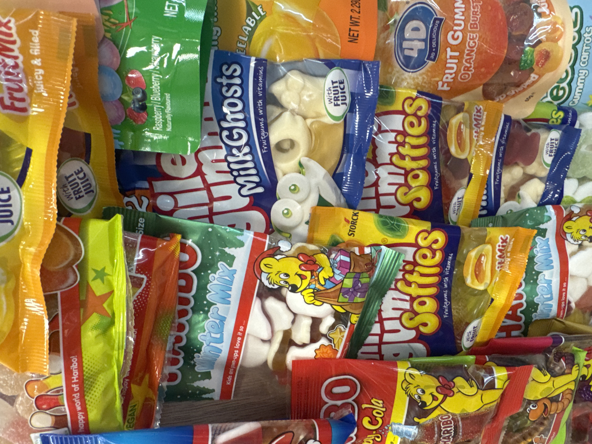 collection of various bags of candy. Prominent brands include Haribo, Storck, and 4D. Candy types visible are fruit gums, gummy carrots, fruit mix, cola-flavored candy, and ghost-shaped candy. The bags are of different sizes and colors. There is no information in the image that suggests that the location is in the city of Targovishte, Bulgaria.