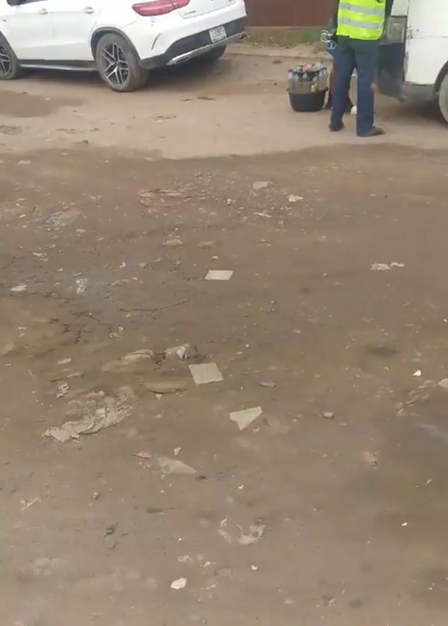 The video depicts an outdoor scene on a dirt road. A white Mercedes-Benz SUV is parked beside the road. A man wearing a yellow reflective vest and dark pants stands near a white van, appearing to open the driver's side door. A bucket sits near the van. A small shop with people sitting under an awning is visible in the background. The road is uneven and covered with dirt, rocks, and scattered debris. A brown fence and some buildings are visible in the background. The weather appears to be overcast.