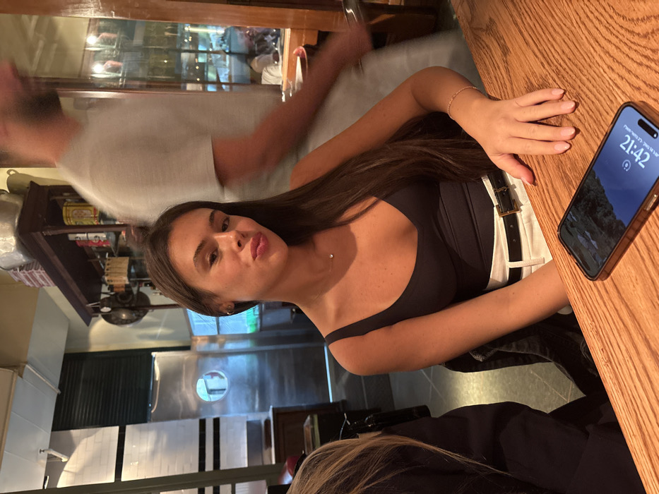 The image depicts an indoor scene within a restaurant or bar in Tel Aviv, Israel, identifiable by the Hebrew text on the smartphone display. In the foreground, a young adult female with long, dark brown hair and a light complexion is seated at a light-colored wooden table, looking directly at the camera with her lips slightly pursed. She is wearing a dark, possibly black or navy, spaghetti-strap top and white pants with a dark belt. A delicate necklace with a small pendant and a thin bracelet are visible. A dark-colored smartphone with a light-colored case rests face-up on the table, displaying the time 21:42 and Hebrew text indicating "Friday, April 21st." To the far left, the shoulder and partial head of another individual are visible, suggesting another diner. In the mid-ground, behind the main subject and to the right, a blurred male figure in a light-colored t-shirt is in motion, moving leftward, likely a staff member. The background reveals an establishment with a mix of industrial and rustic decor: a tiled wall with dark grout lines, a silver-toned service door with a circular window, and a dark wooden shelving unit displaying metal pots, stacked rectangular boxes, and a yellow tin, possibly for Matzo Meal. A reflective surface, likely a mirror or glass, is also visible in the background, showing reflections of the interior.