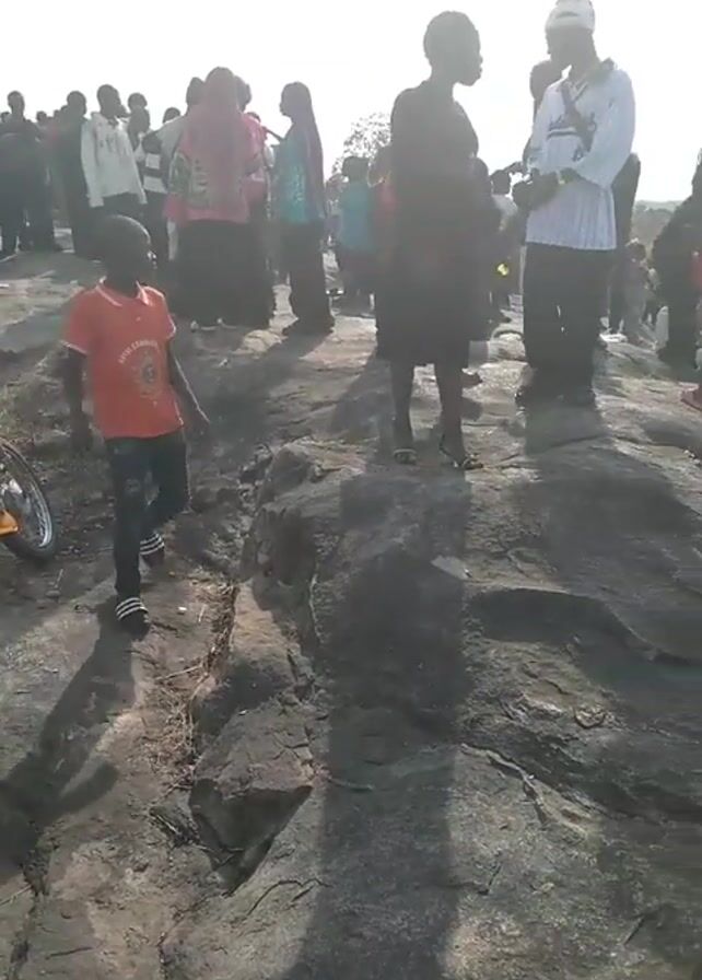 group of people gathered on a rocky terrain. The crowd includes men, women, and children, some wearing traditional clothing. A young boy in an orange shirt and jeans is walking towards the crowd, stepping carefully on the rocks. Two motorcycles are parked nearby. The sky is bright, suggesting it might be daytime. The terrain is uneven and rocky. The crowd appears to be standing or sitting.