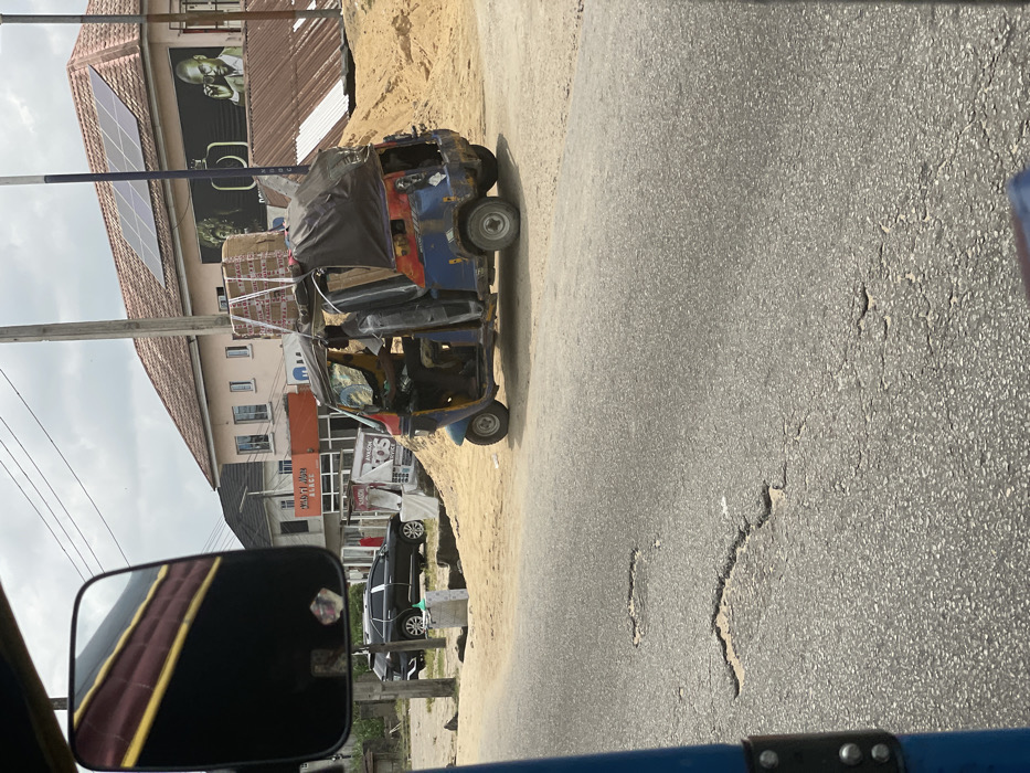 The image depicts a street scene in Yenegoa, Nigeria, under an overcast sky. In the midground, a blue and red three-wheeled motorized rickshaw (keke napep) is positioned off the main asphalt road, on a sandy shoulder. The rickshaw is heavily loaded with cargo, including several stacked cardboard boxes, some marked "FRAGILE," secured to its roof with white straps. Beneath the boxes, a large roll of light brown material is visible. The rear of the vehicle is covered with a dark tarpaulin. Two individuals are visible inside the rickshaw; one occupies the driver's seat, wearing a dark shirt. To the immediate right of the rickshaw, a substantial pile of light-colored sand or earth is present. In the background, a two-story building with a light-colored tiled roof is visible. Solar panels are installed on its roof. The building's facade features a large billboard or mural displaying images of a woman and a man wearing glasses. Below this, ground-floor businesses are present, including one with a sign reading "BABYLON BLACK" and another displaying "AYASON POS SERVICE." Further left, a dark-colored SUV is parked on a dirt area. Utility poles and overhead power lines traverse the scene. The foreground shows a section of asphalt road with visible cracks and potholes. The perspective is from within another vehicle, with a portion of a blue frame and a side-view mirror reflecting a vehicle's interior visible on the left.