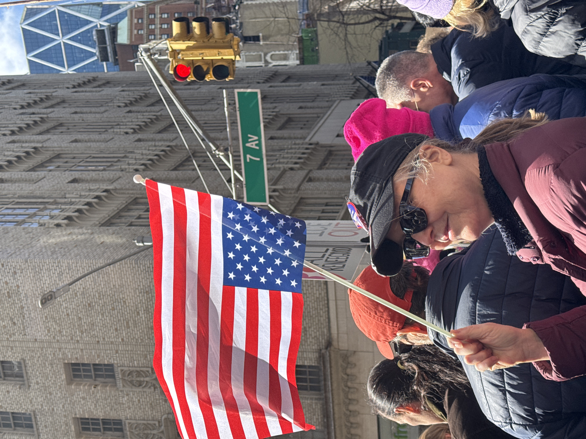 A group of people is gathered on a street in New York City, United States of America. One person is holding a small American flag on a white stick. A street sign labeled "7 Av" is visible. Traffic lights are overhead, displaying a red light. Buildings are in the background, including a distinctive skyscraper and a building with a brick facade.