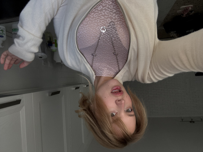 An image taken in Anzio, Italy, shows a young adult female captured in a self-portrait. She has light-colored hair with bangs and maintains direct eye contact with the camera, her lips slightly parted. She is dressed in a light pink, textured, high-neck garment, overlaid by an unzipped, cream-colored cardigan. A silver-toned chain necklace with a Hamsa-style pendant rests on her chest. Her left arm is partially visible, extended forward, indicating she is holding the camera. Her right hand is raised to shoulder height, palm open and facing upwards. The immediate background to her left features a white brick wall, a dark ceiling light fixture, and a dark floor where a dark bag and light-colored slippers are visible. To her right, a kitchen environment is present, characterized by white upper cabinets with dark horizontal handles, a light backsplash, and a countertop displaying a white electric kettle, various bottles, and a white pump soap dispenser.