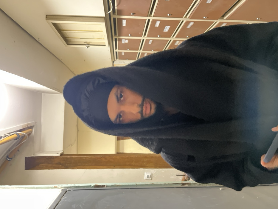 A man wearing a black hoodie and a black cap, positioned at an angle, fills the frame. His face is partially obscured by the hoodie, but his eyes and facial hair are visible. Behind him, there's a beige-colored wall and a set of mailboxes arranged in a grid pattern. The top left of the image features a white ceiling with a square opening. In the foreground, a grayish-blue surface is visible. The image is slightly rotated.