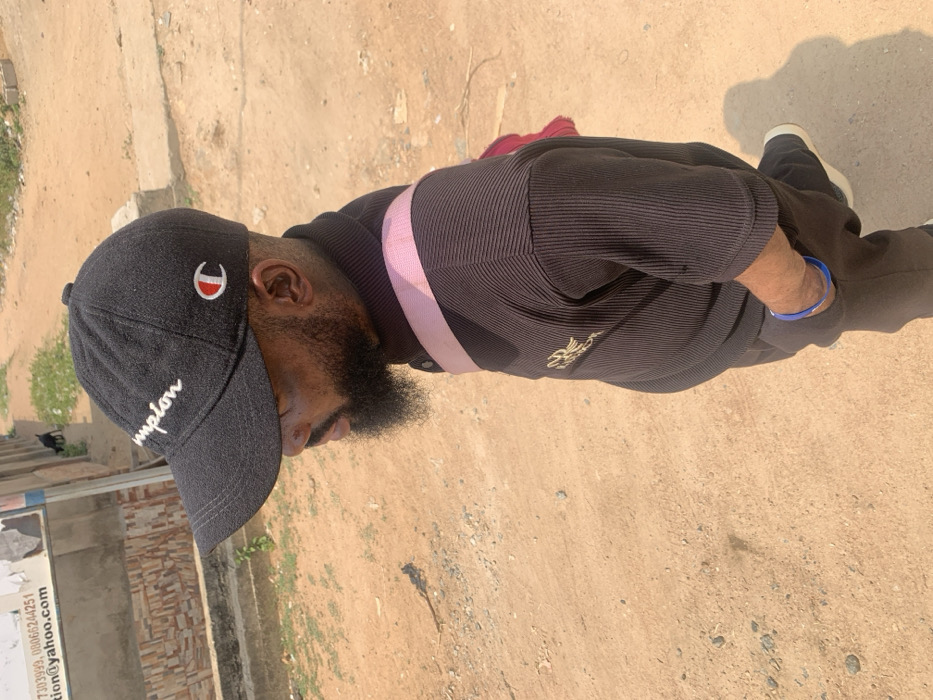 A male individual is depicted walking outdoors on a dirt path in Eika-Adagu New Layout, Nigeria