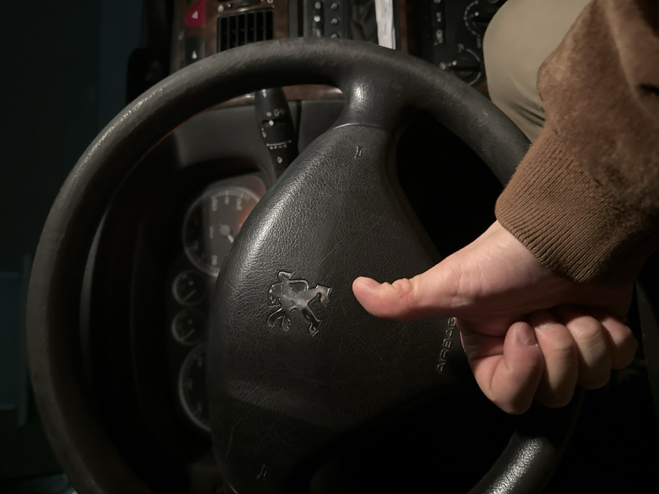The image depicts the interior of a vehicle, specifically the driver's perspective from within a car located in Montana, Bulgaria. A light-skinned human right hand, clad in a brown ribbed sleeve, is prominently positioned in the lower-right foreground, performing a thumbs-up gesture. The hand is angled towards the upper left. Dominating the central frame is a black, textured steering wheel, displaying a metallic Peugeot logo at its center and the word "AIRBAG" embossed below it. Behind the steering wheel, portions of the vehicle's dashboard and instrument cluster are visible, including what appear to be unilluminated gauges. To the right of the steering wheel, a black wiper stalk is discernible, along with a section of the center console featuring air vents with wood-grain trim and a dimly visible red triangular hazard light button. The scene is illuminated by low, ambient light.