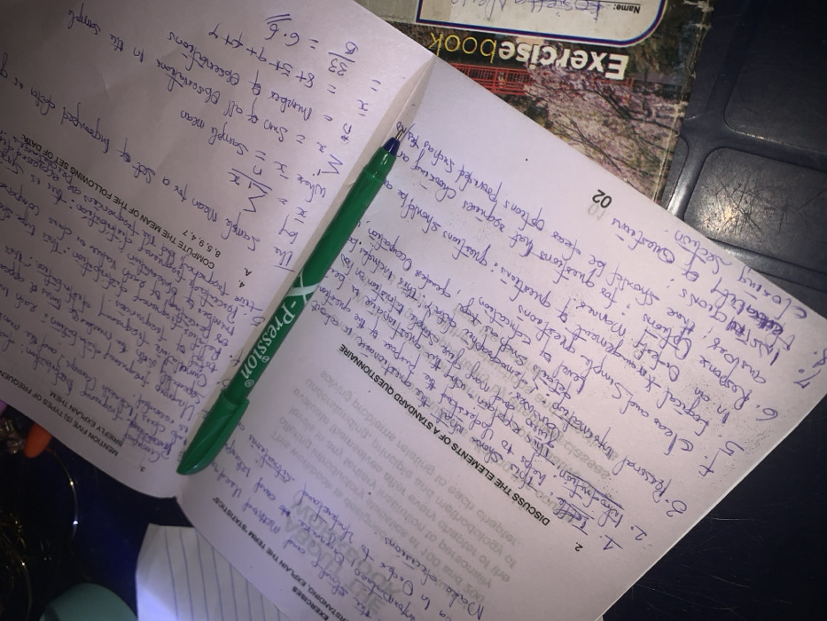 An overhead view captures an academic study setup located in Anantigha, Nigeria. The central subject is an open textbook or spiral-bound notebook displaying handwritten notes in blue ink across its two pages. A green "X-Pression" brand pen rests diagonally across the spine of the open book, with its tip pointing towards the upper left. On the visible left page, the headings "EXERCISES" and "UNDERSTANDING EXPLAIN THE TERM 'STATISTICS'" are printed, accompanied by handwritten definitions related to statistics. The print on this page appears partially reversed due to the paper's transparency or underlying text. The right page contains more extensive handwritten notes. At the top, a section titled "MENTION FIVE (5) TYPES OF FREQUENCY..." lists and briefly describes statistical concepts like "Grouped frequency distribution" and "Cumulative frequency." Below this, a problem asks to "COMPUTE THE MEAN for a Set of Ungrouped data" with given numbers (8, 5, 9, 4, 7). The solution demonstrates the mean calculation: "X = Sum of all Observations / Number of Observations = 33 / 5 = 6.6." Further down, a new section begins with "DISCUSS THE ELEMENTS OF A STANDARD QUESTIONNAIRE," followed by a numbered list including "1. Title," "2. Introduction," "3. Personal Information," "4. Clear and Simple Language," "5. Logical Arrangement," "6. Response Options," "7. Instructions," and "8. Preamble...Closing Section." To the lower right of the primary book, a segment of another notebook, labeled "Exercisebook" with the partially visible name "Rosette..." and "Name:" field, is present. This notebook features a patterned cover with what appears to be a landscape or floral design. The background, particularly in the upper left corner, is dark and indistinct, showing hints of a light blue cup or container and some metallic objects. The scene is illuminated by an overhead light source, casting some shadows and highlighting the paper.