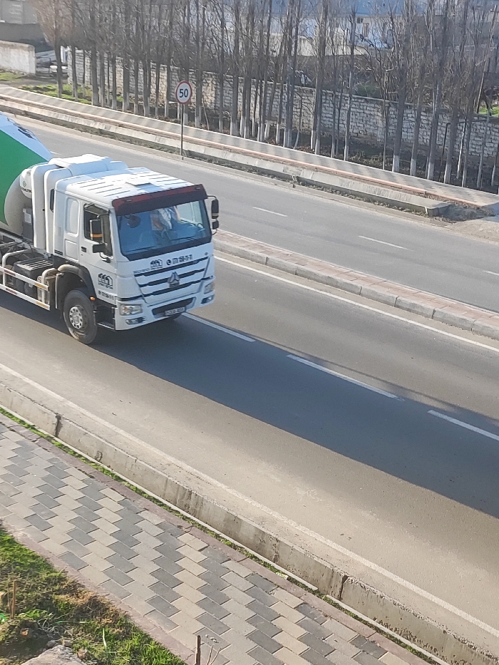 - "A white SINOTRUK HOWO concrete mixer truck, featuring a green mixing drum, is captured in motion on an asphalt road in Jizzakh, Uzbekistan" by FM-wRU8q2, licensed under CC BY 4.0