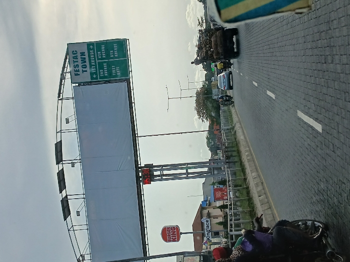 road with vehicles and pedestrians. There's a large sign indicating "FESTAC TOWN" with directions to 1st Avenue, 2nd Avenue, 4th Avenue, First Gate, and 6th Avenue. Adjacent to the road is a Burger King and Kinglace restaurant. The sky is partly cloudy. A large billboard is visible in the background. The road surface is paved.