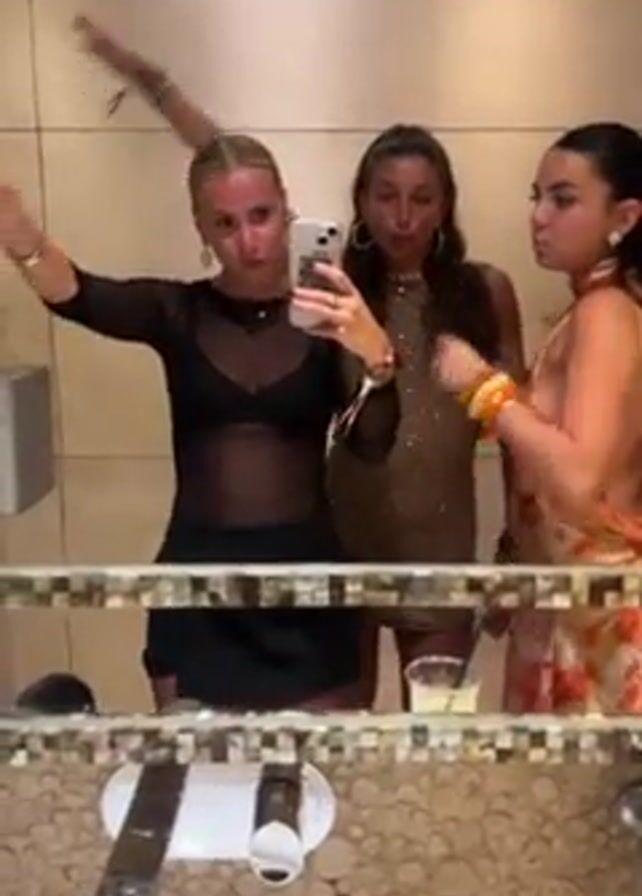 Three young women are taking a selfie in a restroom mirror. The woman on the left is wearing a black mesh top over a bra and a black skirt, her hair is pulled back. The woman in the middle is wearing a sequined dress and has her hair down. The woman on the right is wearing a floral print dress with her back exposed and has her hair down. They are all making hand gestures and posing for the camera. There is a cup with a straw in the sink in front of them. The restroom has light-colored tile walls and countertops, with a modern faucet.