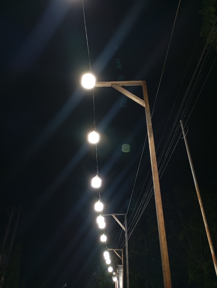 The scene depicts an outdoor night environment in Lhokseumawe, Indonesia. A series of approximately twelve spherical, white light bulbs are illuminated, suspended by thin wires against a dark, featureless night sky; each bulb emits distinct light rays. A prominent, unpainted wooden utility pole or structural support stands vertically on the right side of the frame. Further to the left, a smaller wooden structure with a horizontal crossbeam also supports suspended lights. Multiple thin electrical wires traverse the upper right quadrant of the image, appearing to connect to the main wooden pole. Dark, indistinct silhouettes of trees or dense foliage are visible in the background, primarily on the right side. No individuals or specific human activities are present.
