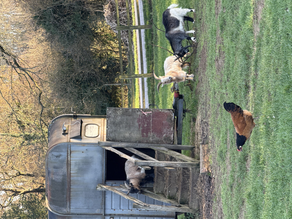The image depicts a rural scene in West Oxfordshire, United Kingdom, featuring livestock and a weathered mobile structure. A rusty, silver-grey metal trailer or portable shelter with a rounded roof stands in the left-midground. A three-step wooden staircase leads to its open doorway on the left, where a small, mottled grey and black goat is descending. An open, reddish-brown wooden panel is affixed to the trailer's right side. On the green grass in the midground, a cream-colored goat with long fur and prominent curved horns stands upright, facing right. Adjacent to it, a smaller grey and white goat with shorter horns engages with multiple fallen branches on the ground. In the foreground, a brown and black chicken walks left across the grass. A wooden fence spans the background, separating the field from a dense thicket of leafless deciduous trees. The scene is illuminated by strong, low-angle sunlight, casting shadows and highlighting the autumnal or winter foliage.