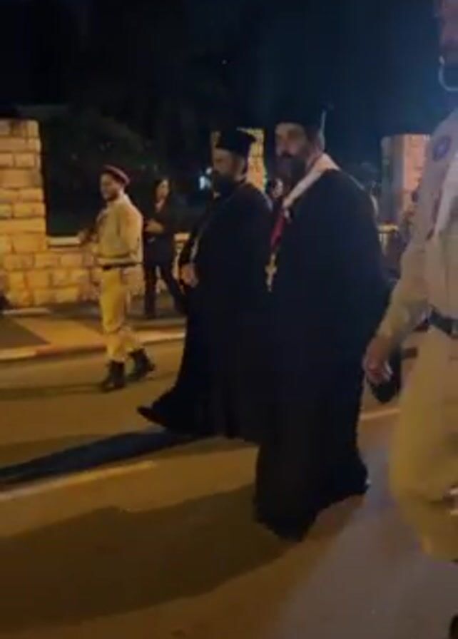 A night scene captures a procession, featuring two Orthodox Christian priests in black robes at the forefront, with one wearing a gold cross. Beside them stand men in beige uniforms and maroon berets. These men are standing on the side of the street with the white street lines, facing left. The street is lit by the street lights and the lights from buildings in the distance. A crowd of people can be seen in the background, and buildings on the other side of the road are illuminated. The scene has a solemn and ceremonial atmosphere.