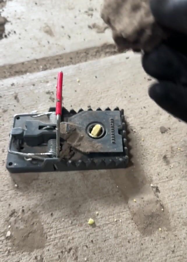 A person wearing a black glove holds a chunk of dirt over a mousetrap
