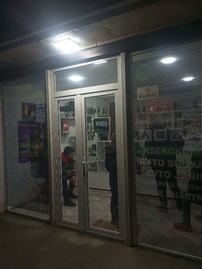 This image depicts a commercial storefront at night in Bolgali, Uzbekistan