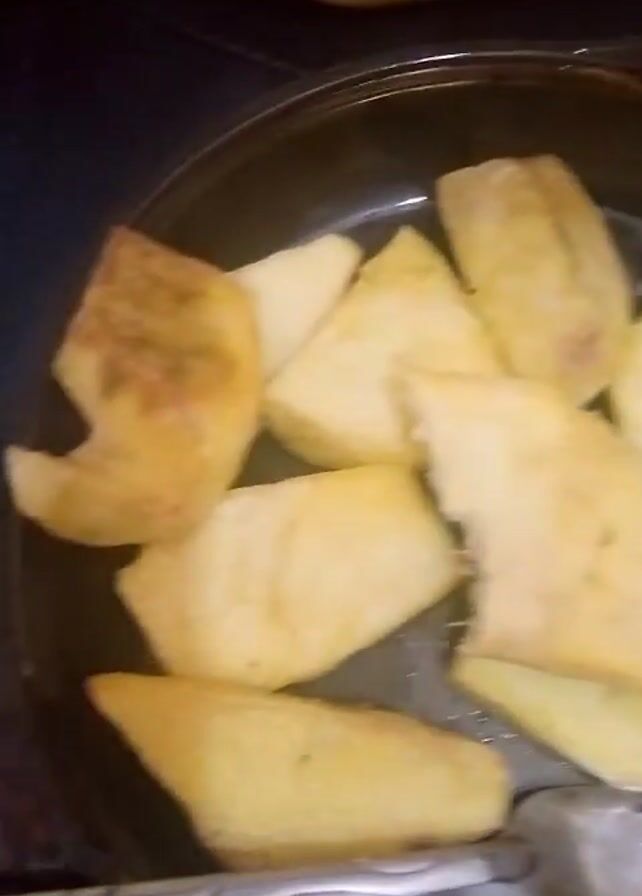 fried yam and what appears to be a creamy, brown colored mixture in a bowl. A white powder is also in the bowl. A person's hand flashes a "peace" sign at the camera while holding the bowl.