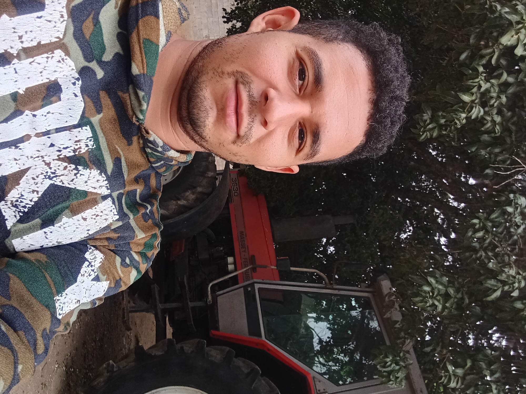 A selfie of a man with short dark curly hair and a trimmed beard wearing a camouflage shirt with white geometric designs. He is standing in front of a red Massey Ferguson tractor, partly obscured by foliage. The scene appears to be outdoors, potentially on a farm or rural area. The specific location in Cujisal, Venezuela cannot be determined from the image.