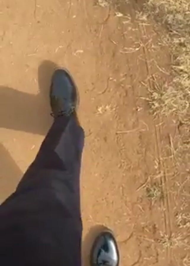 A person is walking on a dirt path. The person is wearing dark-colored pants and black, shiny shoes. The path is bordered by dry grass. The camera is positioned looking down at the person's feet as they walk.