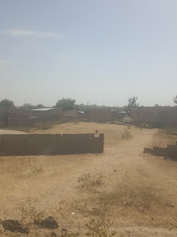 The image depicts a rural or semi-rural settlement in Dabawa, Nigeria, under a hazy, pale blue sky