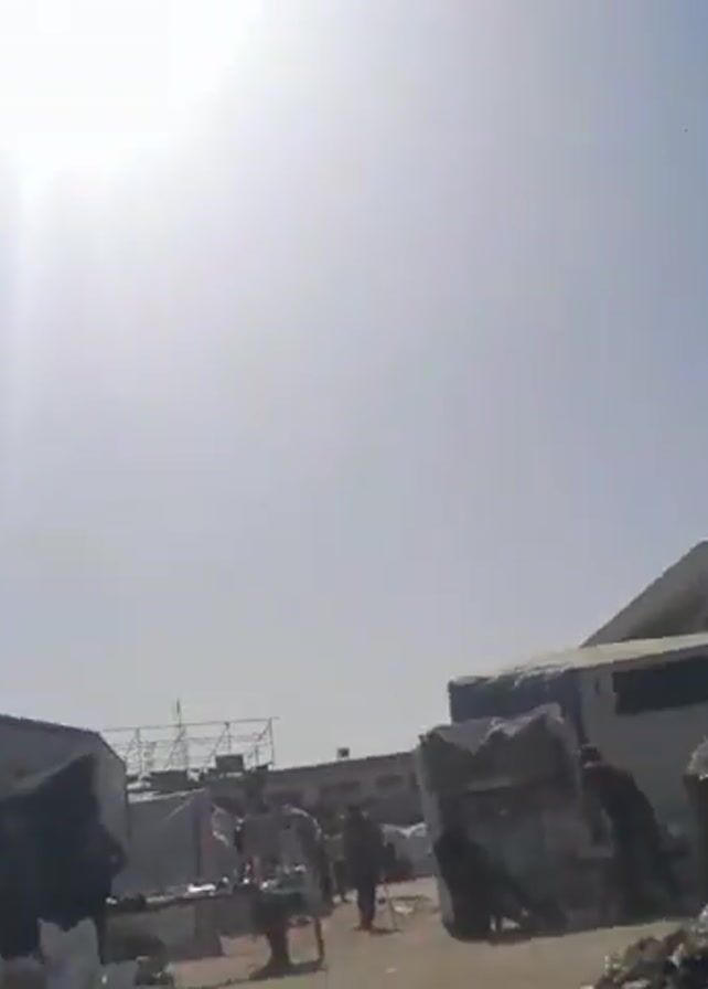 The video appears to be taken from the perspective of someone on a motorcycle, moving slowly through a somewhat cluttered outdoor area. The sun is bright, creating significant glare. To the right of the frame, there's a building with graffiti on its side. Near the building, there are overflowing trash bins, mostly filled with blue plastic bags. There are also hints of people near the building. The motorcycle takes up the lower right portion of the frame, while the sky dominates the top of the shot.
