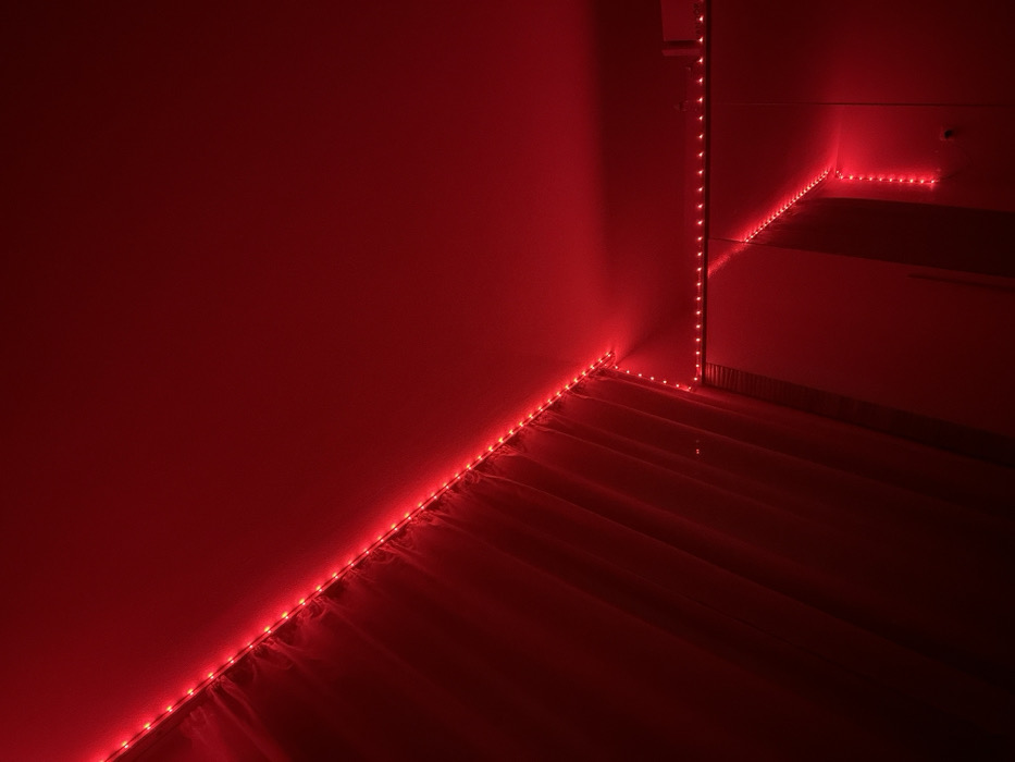 The scene is an interior space predominantly illuminated by red LED strip lights