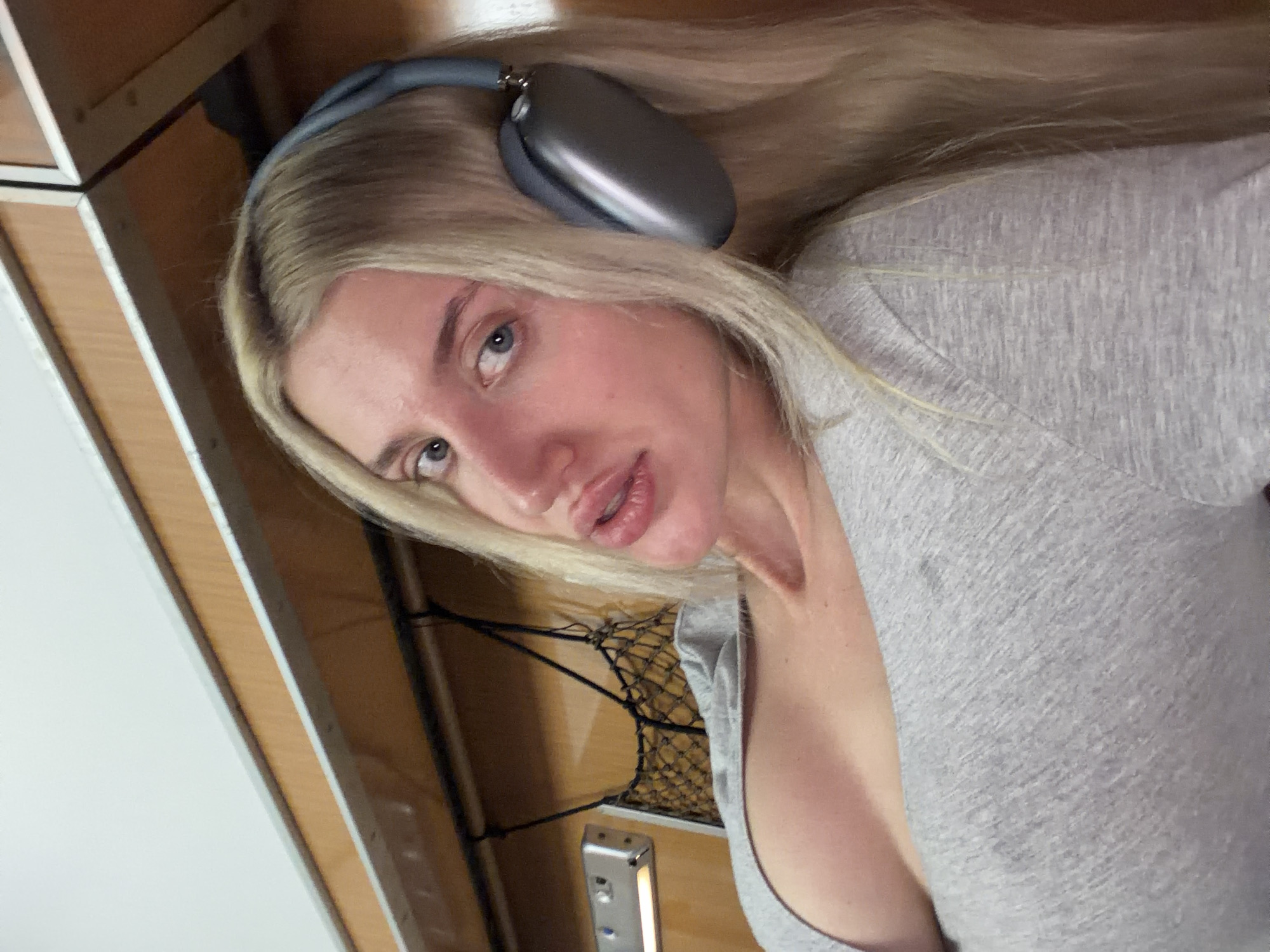 The image features a blonde female, likely in her twenties or thirties, with blue eyes and full lips, looking directly at the camera. She wears a light gray long-sleeved top and gray Apple AirPods Max over-ear headphones. Her head is tilted slightly. The background reveals an interior space with a compact design: a white ceiling panel transitions to a light brown wooden panel, separated by a silver metallic trim. Below this, another wooden panel is visible. To the viewer's left, a silver rectangular light fixture is mounted on the wooden panel, and a black mesh storage net hangs below it. The environment's characteristics, including the wooden panels, trim, light fixture, and storage net, are consistent with a train cabin, RV, or similar travel accommodation. There are no discernible visual cues within the image to specifically identify a location in Virpazar, Montenegro.