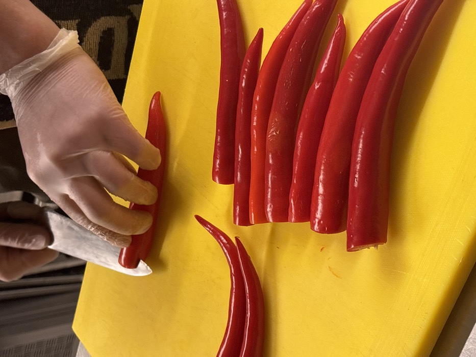 - "A gloved hand holds a long red pepper against a yellow cutting board, ready to slice it with a knife" by FM-ARrGE2, licensed under CC BY 4.0