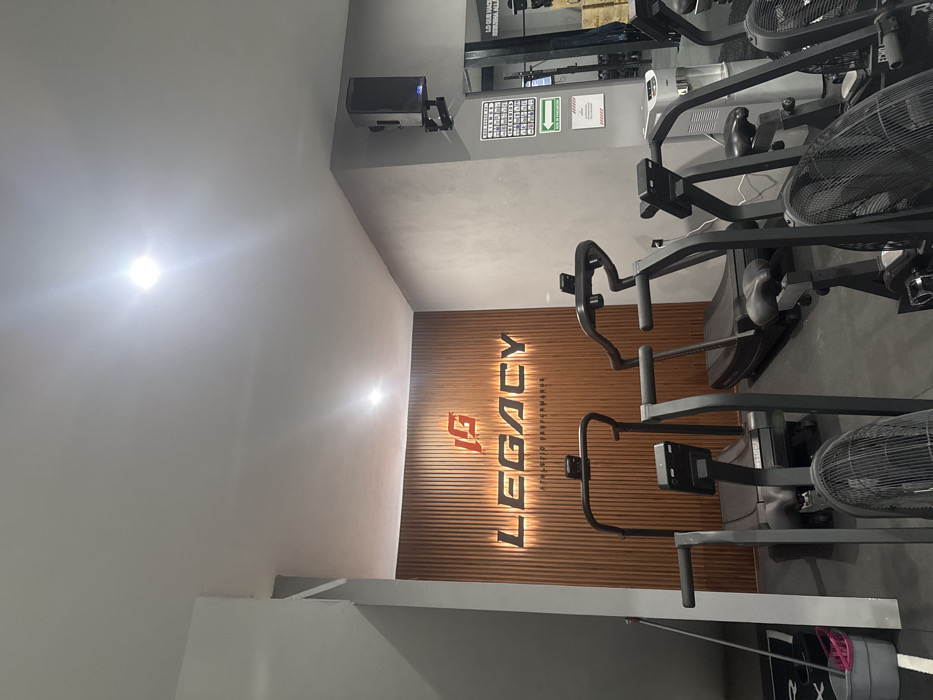 A gym interior features exercise bikes in the foreground. Behind the bikes, a wood-paneled wall showcases a lighted "LEGACY" sign, with "ATHLETIC PERFORMANCE" beneath. A TV is mounted high on the wall. Emergency evacuation instructions are posted beside a mirror. The floor is gray. The ceiling is bright white.
