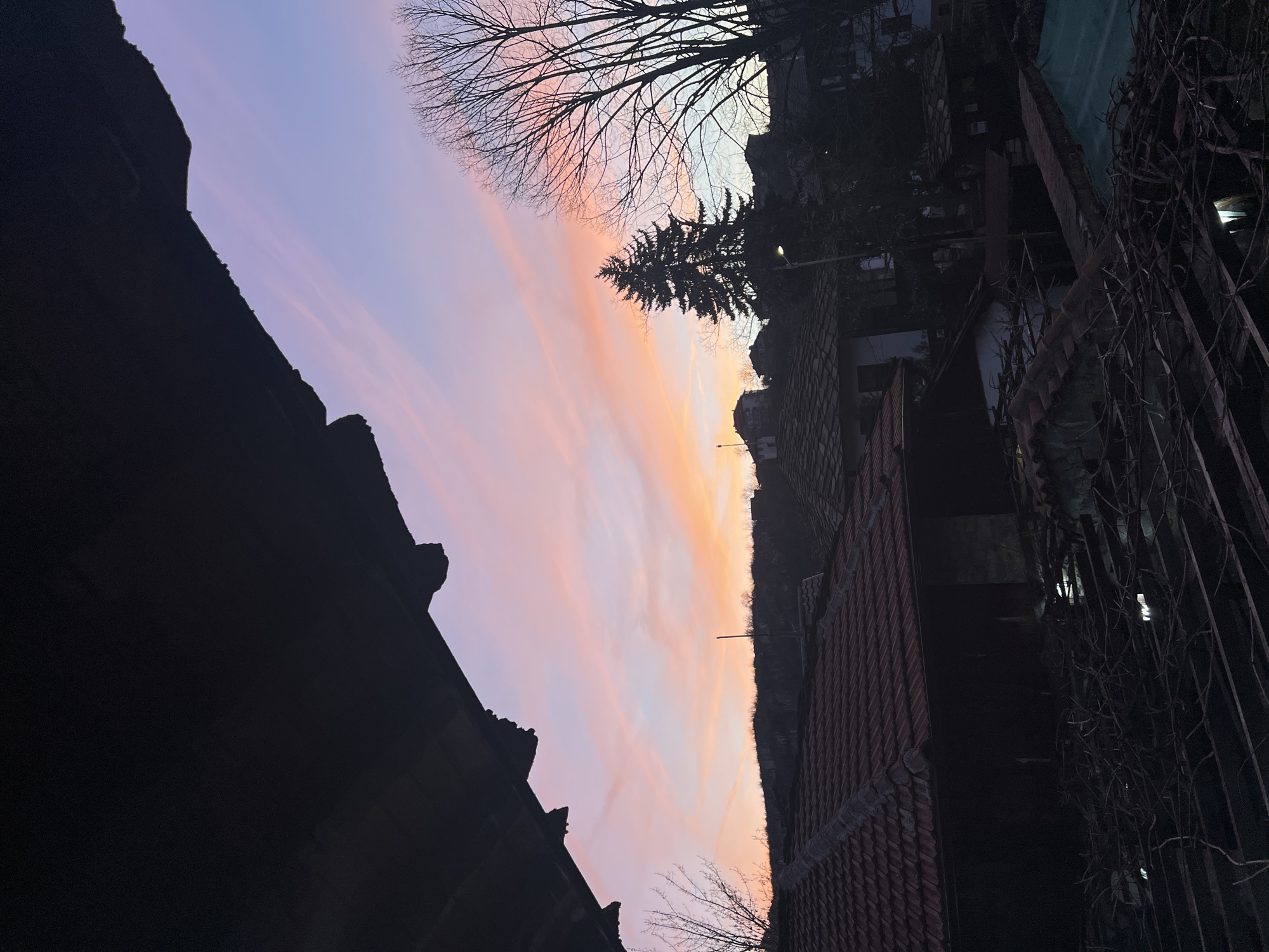 The image, rotated 90 degrees counter-clockwise, shows a dusk scene in Lovech, Bulgaria. In the foreground, there's a silhouette of a building roof on the left. On the right, there's a building with a tiled roof and a fence with intertwining vines. The sky is a mix of pastel colors, predominantly purple and orange. A conifer and a deciduous tree are visible against the sky. There is a building behind the trees. A street lamp is also present.