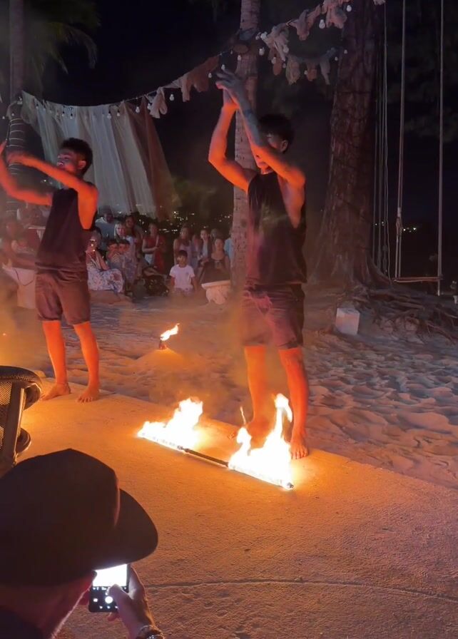 Two young men are performing a fire show on a beach at night. They are barefoot and wearing dark shorts and tank tops, which they remove during the performance. A rectangular piece of equipment with flames is on the ground. One of the performers is standing on the burning equipment. A crowd is watching the show in the background, and string lights are strung between palm trees. In the foreground, a person wearing a black cap is sitting in a chair and filming the show with a cell phone. The beach sand is visible.
