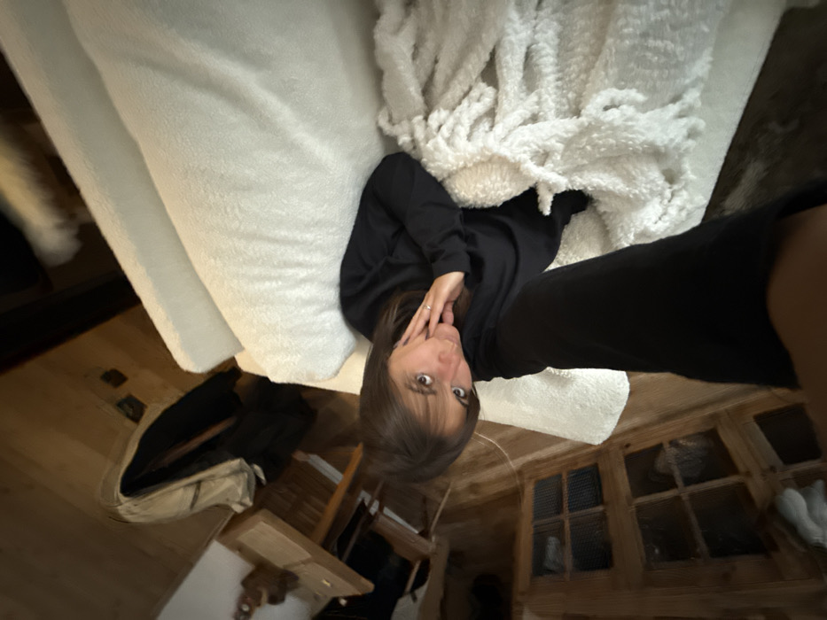 A person with brown hair and bangs, wearing black clothing, lies on a fluffy white bed