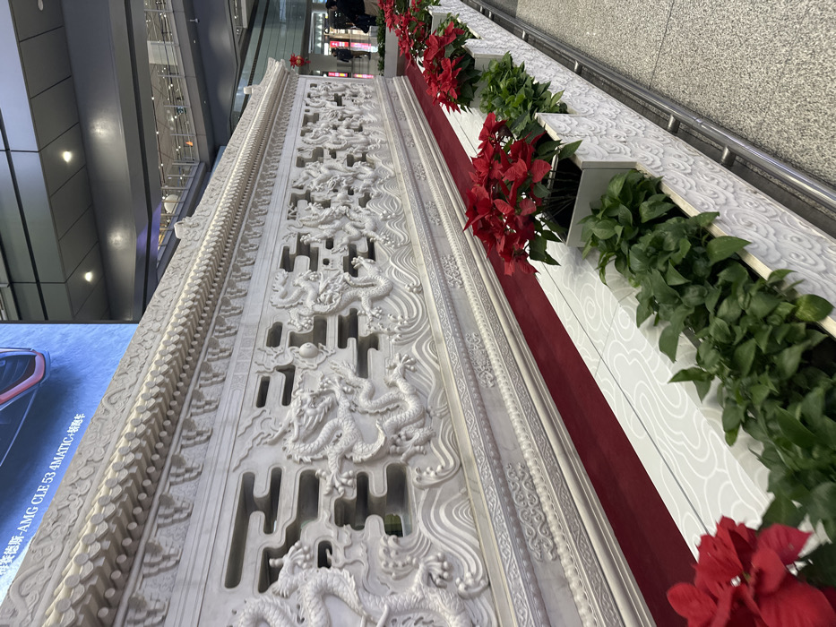 The image displays an interior scene from Beijing Capital International Airport (PEK), located in Shunyi District, China. A prominent feature is a long, ornate white balustrade or decorative barrier, positioned diagonally across the frame from lower left to middle right. This structure is extensively carved with multiple detailed Chinese dragons, stylized waves, and cloud patterns. The top edge of the balustrade features a design mimicking traditional Chinese roof tiles, and sections contain geometric cut-out patterns. A narrow strip of red fabric or carpet runs along the base of this carved barrier. In the immediate foreground and parallel to the balustrade, a series of white planter boxes are arranged. These planters contain alternating sections of green leafy plants and red-leafed plants, resembling poinsettias. The sides of the planter boxes are decorated with white relief carvings of cloud motifs. The floor is a light grey, speckled terrazzo or polished concrete material, with a silver metal railing visible on the right side of the planter arrangement. Above the carved balustrade, a large digital display screen is visible, presenting an advertisement for a "Mercedes-AMG CLE 53 4MATIC+" with additional Chinese text. Beyond this screen, the multi-level architecture of the airport terminal is evident, characterized by glass partitions, grey support structures, and integrated overhead lighting. In the far background, several indistinct human figures are visible moving through the terminal, and a red Chinese lantern hangs as a decorative element.
