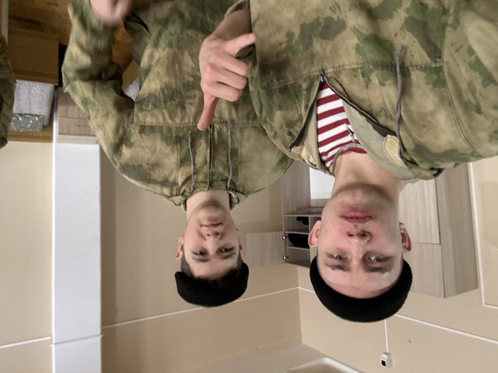Two young men wearing black knit caps and camouflage jackets stand in an interior room. One man wears a red and white striped shirt underneath his partially unzipped jacket, while the other points downward with one hand. The room has light beige walls and cabinets in the background. The image is rotated 180 degrees.