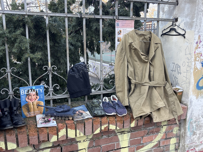 A collection of miscellaneous items is displayed on a low brick wall and a metal fence in Prague, Czechia. The immediate background consists of dense green evergreen bushes behind an ornate dark metal fence, and a light-colored concrete wall extensively covered with black, blue, and yellow graffiti. On the brick wall, from left to right, are: a pair of black ankle boots; an "active BEAUTY" magazine featuring a smiling woman with the text "Kouzlo zimy"; a dark grey toy tank with tracks; a partially obscured magazine or booklet; a green camouflage toy tank; and a pair of dark blue athletic shoes with white soles and red accents. The brick wall beneath these items shows yellow and black spray paint markings. Attached to the metal fence are several items. A black knit cap with a white design hangs to the right of the "active BEAUTY" magazine. A tan, belted trench coat hangs on a wire hanger from a hook on the fence structure, to the right of the knit cap. An empty black plastic clothes hanger is suspended further to the right from a separate hook. A pink rectangular sign with a QR code and Czech text, including "OBCHODNÍKŮV PRVNÍ VÝSTAVA," is affixed to the fence above the magazines and to the left of the trench coat. No individuals are present in the scene.