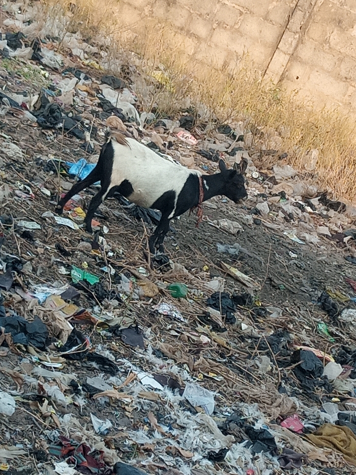 - "A black and white goat with a red collar stands on a trash-covered hill" by FM-JM06x2, licensed under CC BY 4.0