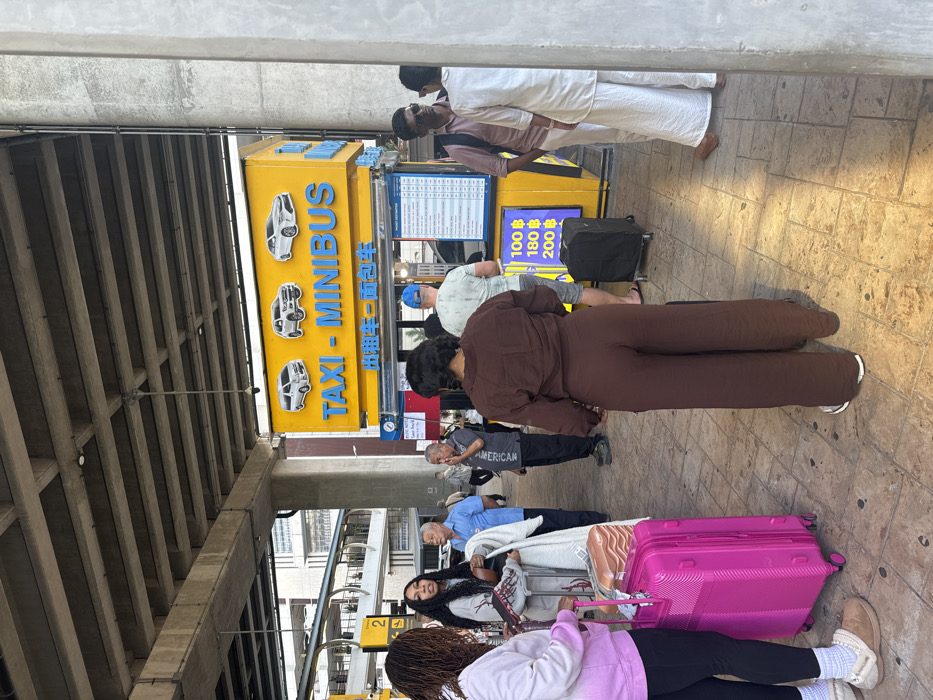 A yellow taxi and minibus stand with car images and a price list (100, 180, 200) is visible. People are queuing next to it. Some have luggage. One has a bright pink suitcase. Others are wearing casual clothes, including a shirt with "AMERICAN" on it. A concrete roof structure covers the area.