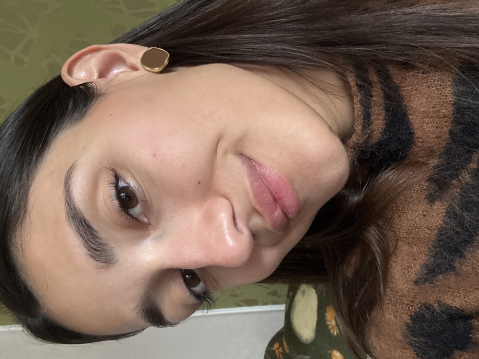 A close-up photograph depicts a female individual in an indoor setting within Novi Sad, Serbia. The subject has medium skin tone, dark brown hair, and brown eyes. Her lips are slightly parted, exhibiting a light pink tint, and she displays a subtle, closed-mouth smile. Her eyebrows are well-defined. She is wearing a brown and black patterned, possibly animal print, turtleneck sweater with a visible fuzzy texture. A single, irregular, gold-colored stud earring is present on her right earlobe. The background is out of focus, revealing a dark green object, possibly an upholstered piece of furniture such as an armchair, with faint lighter patterns. A light-colored vertical surface is partially visible behind the green object. The subject is directly facing the camera.