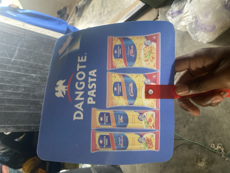 A dark-skinned hand holds a blue, rectangular hand fan with a red plastic handle secured by a silver rivet. The fan prominently displays the "DANGOTE PASTA" logo, featuring a white eagle on a red arch, above the brand name in white text. Below, four images showcase different Dangote pasta products: "Spaghetti Standard" (red packaging), "Spaghetti Slim" (orange packaging), "Twist Cavatto" (yellow pasta in a bag), and "Macaroni Elbow" (elbow macaroni in a bag). A small, white sticker with red text, partially peeled, is visible on the fan's upper right edge. The background, set in Agege, Nigeria, consists of a light-colored floor partially covered by clear plastic bags containing indistinct items. In the midground, blurred elements include a person wearing a blue garment, dark footwear, and a dark, vertically ridged surface, indicating an indoor or sheltered commercial environment.