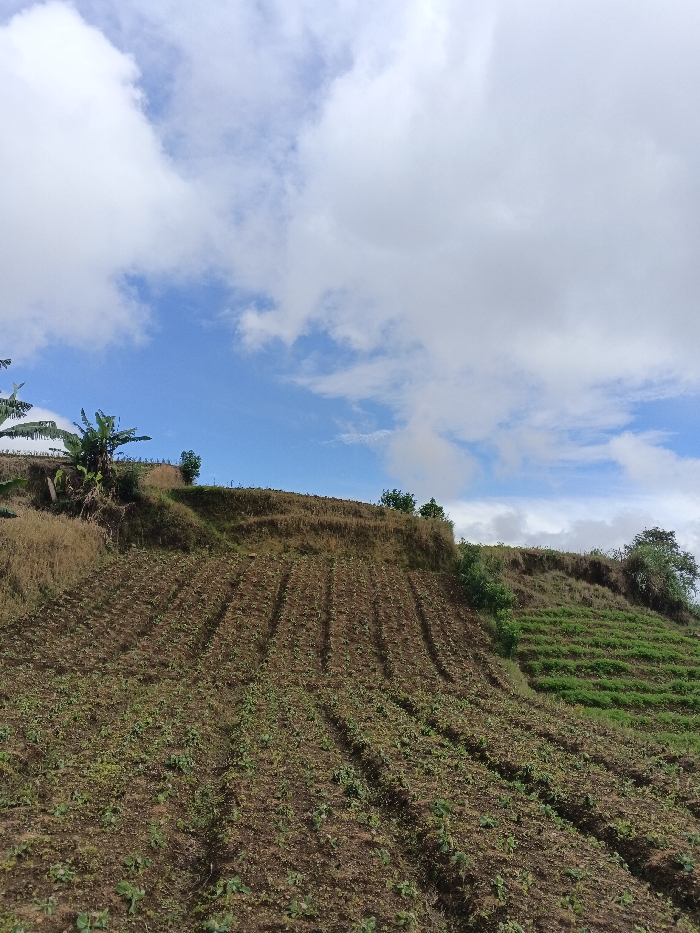 A hillside shows terraced agriculture under a partially cloudy sky. Banana trees are visible on the left. A field of brown earth with rows of young plants occupies the lower portion. Above, a steeper slope features parallel furrows, with taller dry grasses and sparse trees. Further up and to the right, bright green terraces contrast with the drier landscape. The sky is a mix of blue and white, filled with puffy clouds.
