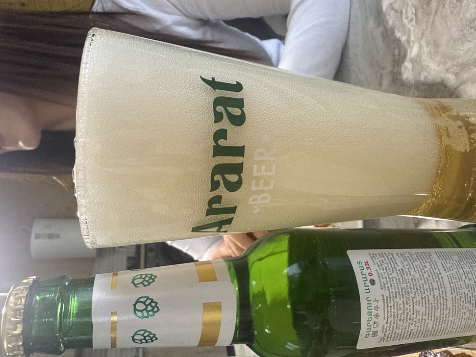 An overhead, close-up view captures a green glass beer bottle and a tall beer glass on a speckled surface, likely a table, within a domestic or commercial interior in Voskevaz, Armenia. The beer bottle, topped with a gold cap, features a white label with three green hop cone graphics and Armenian text, including "0.33L". Adjacent to the bottle, a clear glass is filled with a golden liquid topped by a thick layer of white foam, displaying "Ararat" in green lettering and "BEER" in white lettering. In the blurred background to the right, a person with long dark hair, wearing a white long-sleeved shirt, is partially visible from the chin downwards.